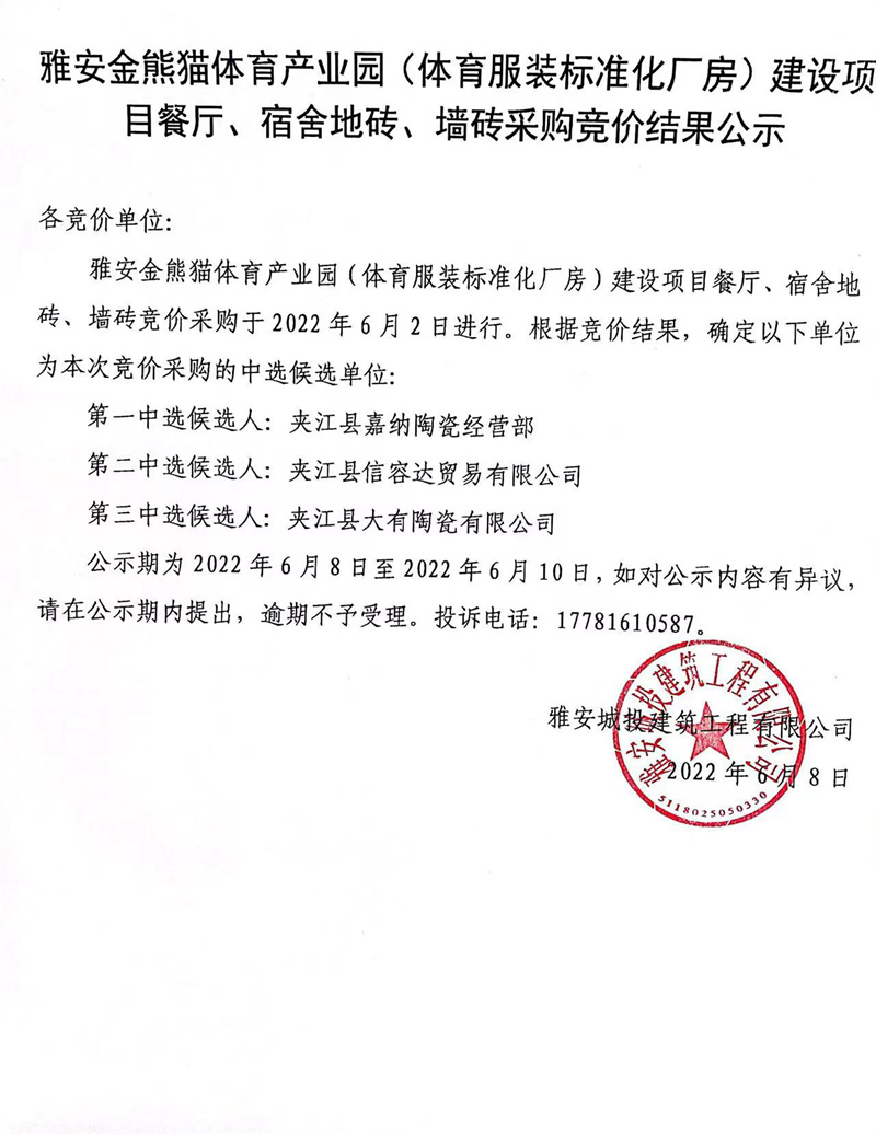 雅安金熊貓體育產(chǎn)業(yè)園(體育服裝標準化廠房)建設項目餐廳、宿舍地磚、墻磚競價結果公示