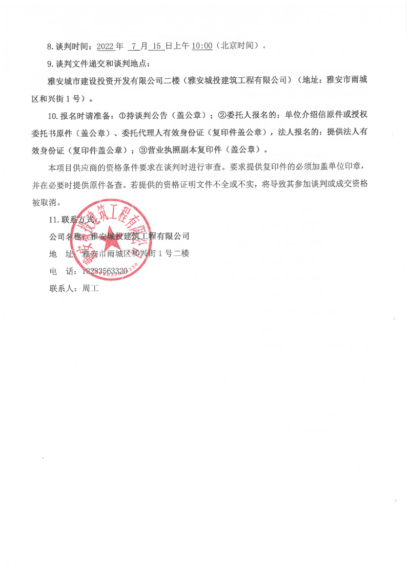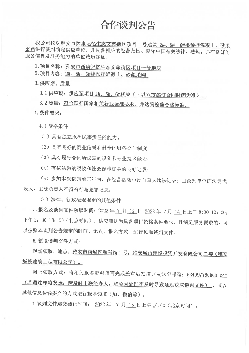 雅安市西康記憶生態(tài)文旅街區(qū)項目一號地塊2#、5#、6#樓預拌混凝土、砂漿采購合作談判公告