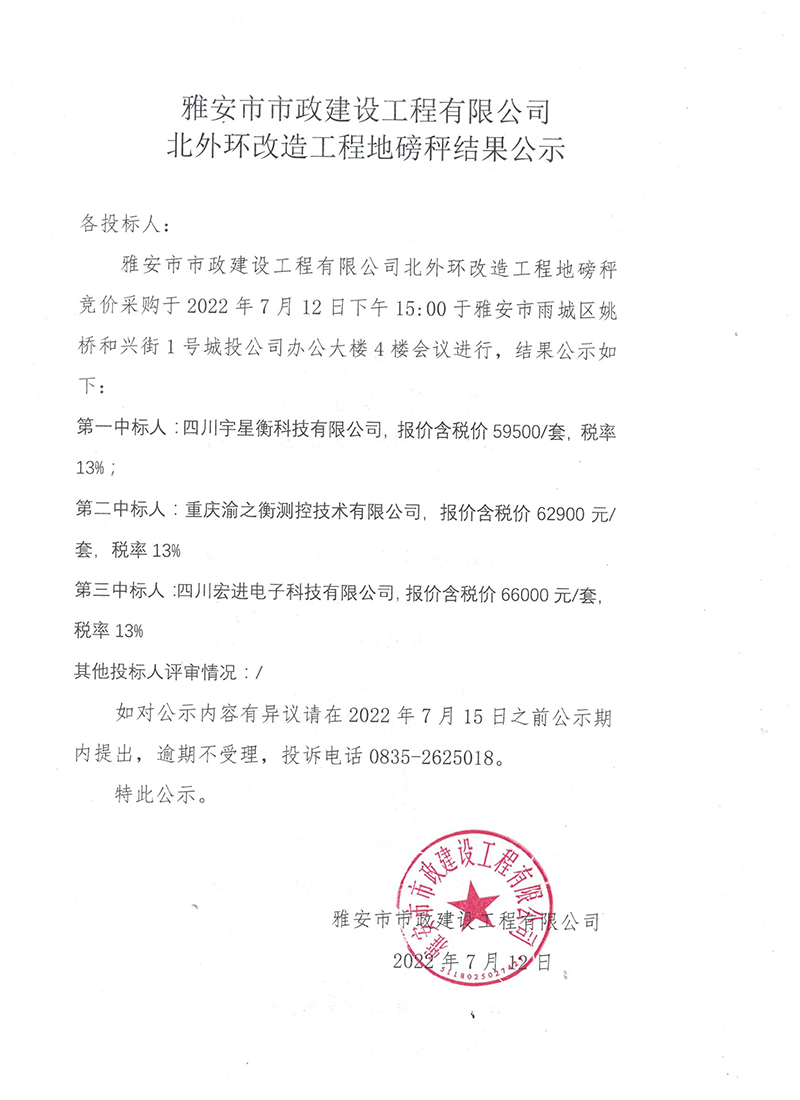 雅安市北外環(huán)改造工程地磅秤詢(xún)價(jià)結(jié)果公示