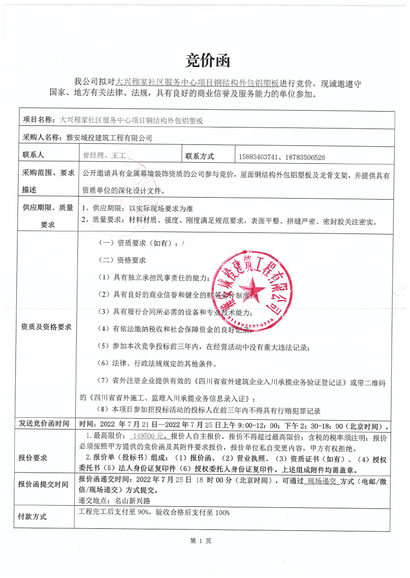 大興穆家社區(qū)服務中心項目鋼結構外包鋁塑板競價公告