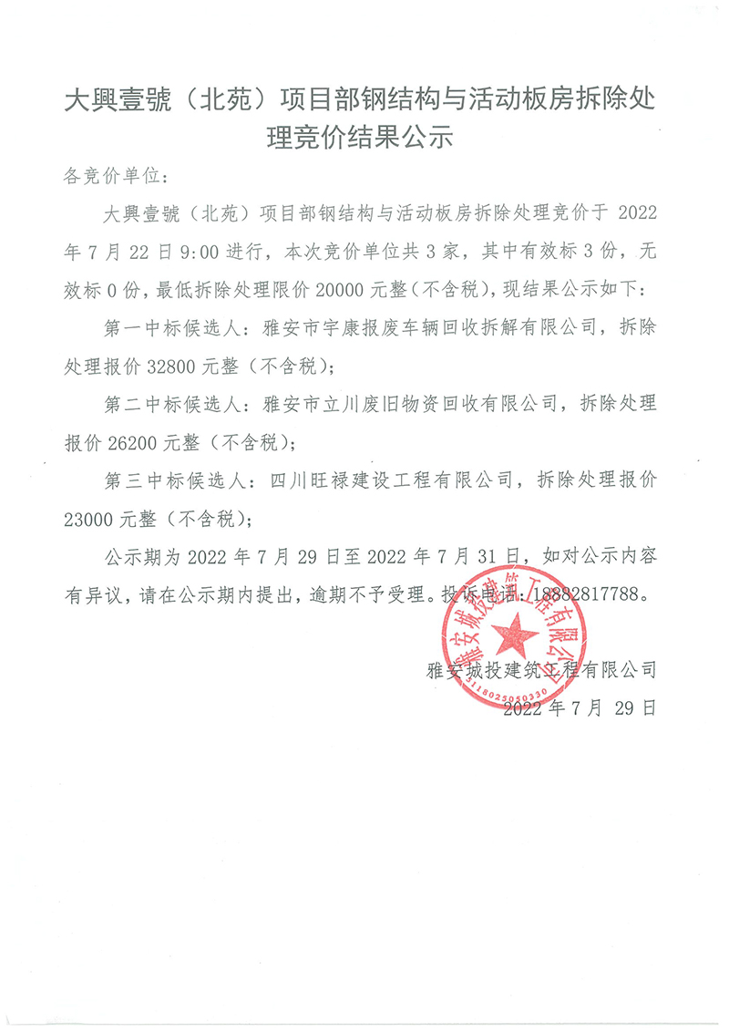 大興壹號(北苑)鋼結(jié)構(gòu)與活動(dòng)板房拆除處理競價(jià)結(jié)果公示
