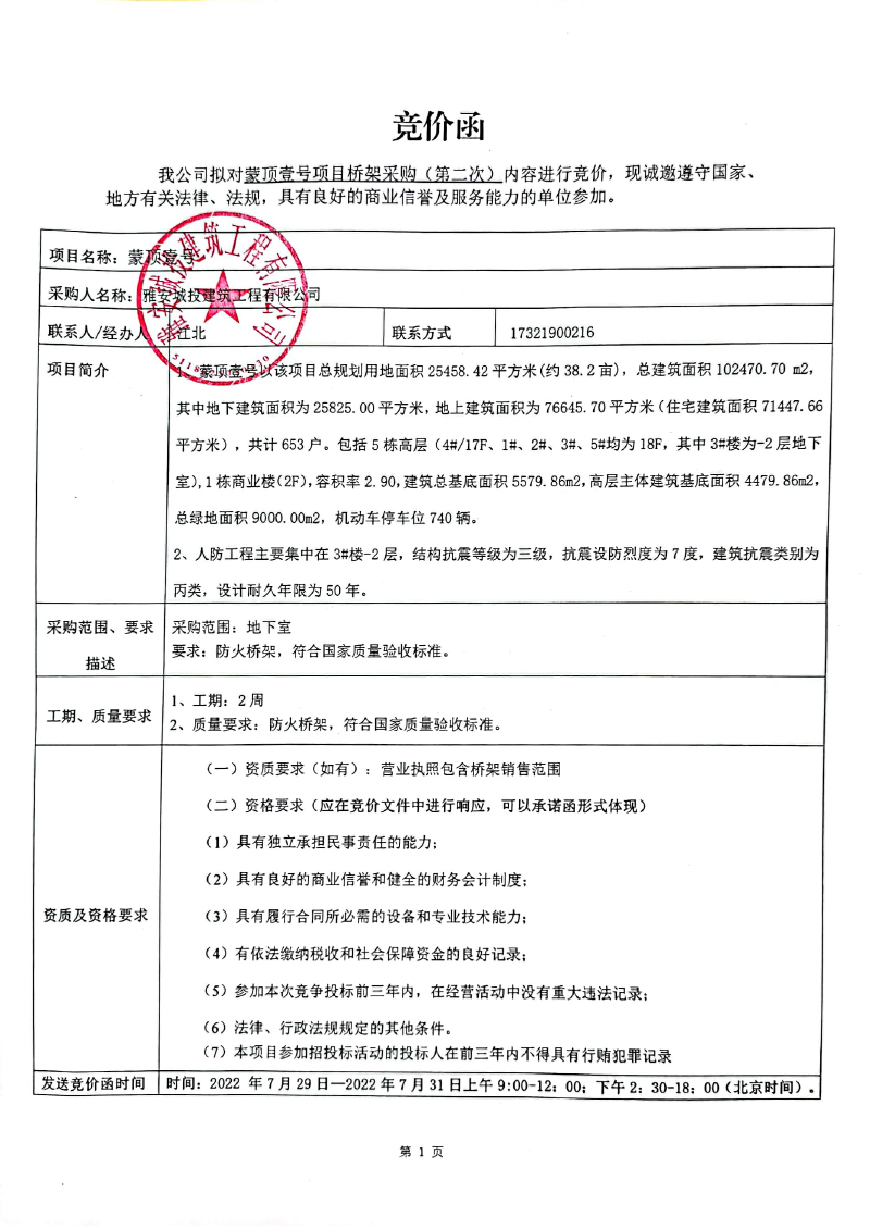 蒙頂壹號(hào)項(xiàng)目橋架采購(gòu)(第二次)競(jìng)價(jià)公告