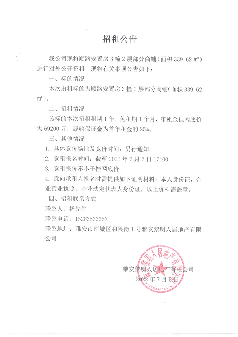 順路安置房3幢2層部分商鋪招租公告