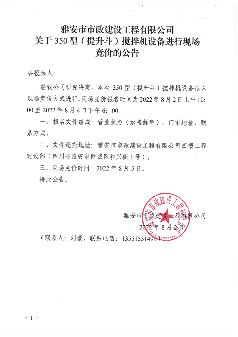 關(guān)于350型(提升斗)攪拌機(jī)設(shè)備進(jìn)行現(xiàn)場競價(jià)的公告