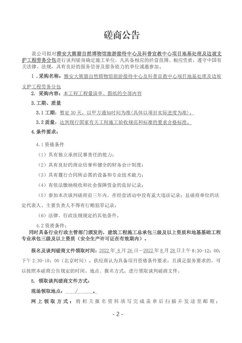 雅安大熊貓自然博物館旅游接待中心及科普宣教中心項(xiàng)目地基處理及邊坡支護(hù)工程談判磋商公告