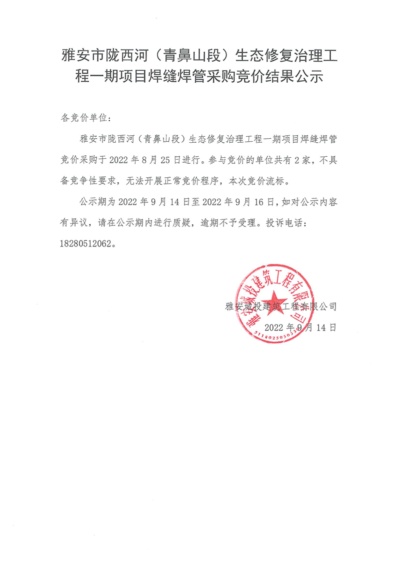 雅安市隴西河(青鼻山段)生態(tài)修復治理工程一期項目焊縫焊管采購競價結果公示