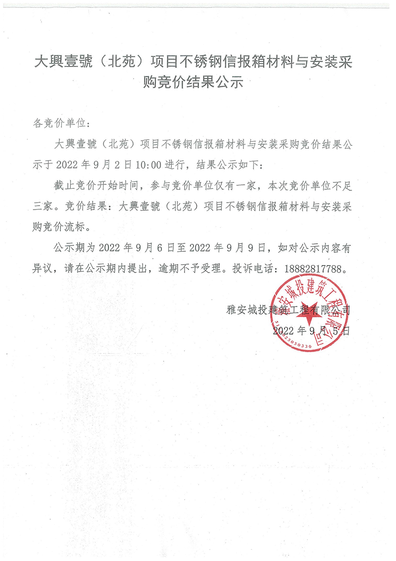 大興壹號(北苑)項目不銹鋼信報箱材料與安裝采購競價結(jié)果公示