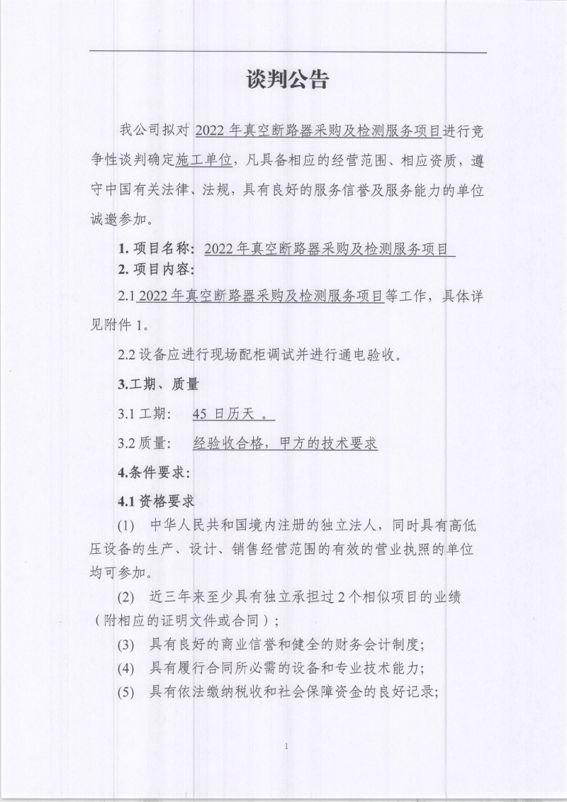 城利水電公司2022年真空斷路器采購(gòu)及檢測(cè)服務(wù)項(xiàng)目競(jìng)爭(zhēng)性談判公告