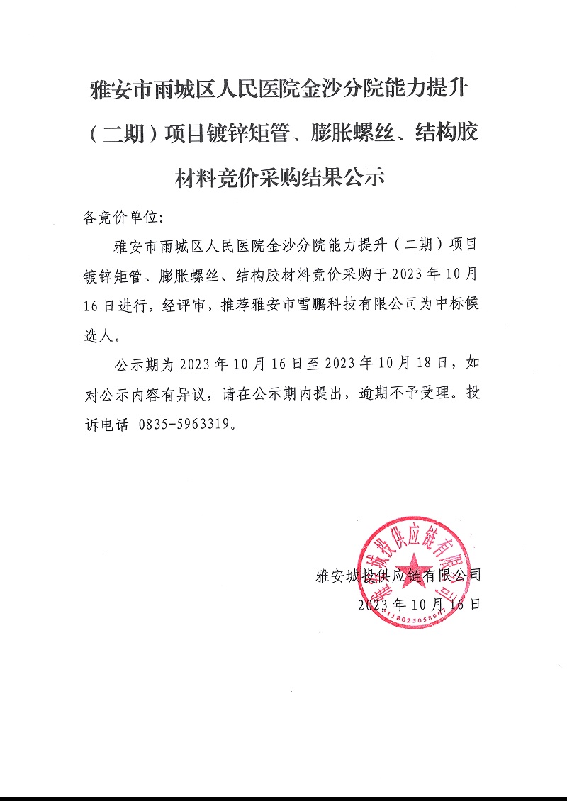 雅安市雨城區(qū)人民醫(yī)院金沙分院能力提升(二期)項(xiàng)目鍍鋅矩管、膨脹螺絲、結(jié)構(gòu)膠材料競價(jià)采購結(jié)果公示