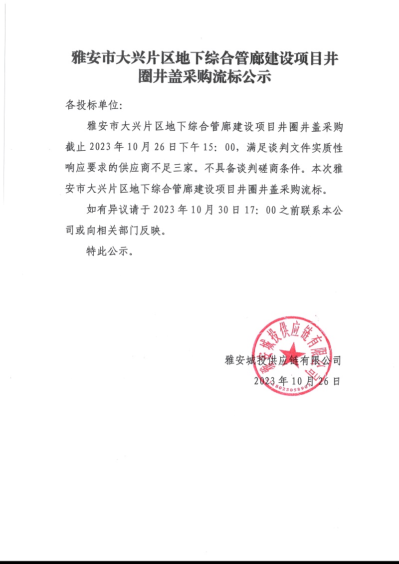雅安市大興片區(qū)地下綜合管廊建設(shè)項目井圈井蓋采購流標(biāo)公示