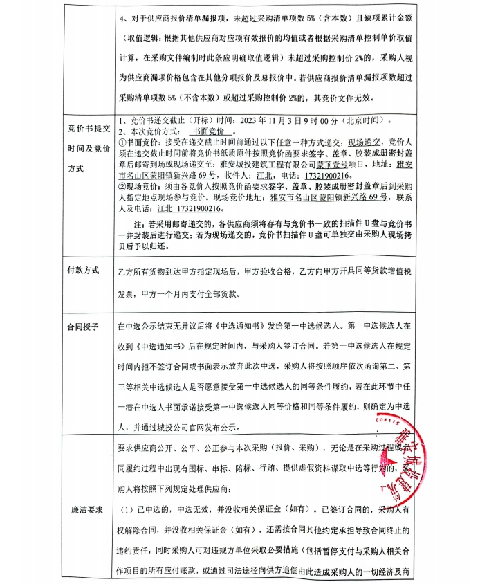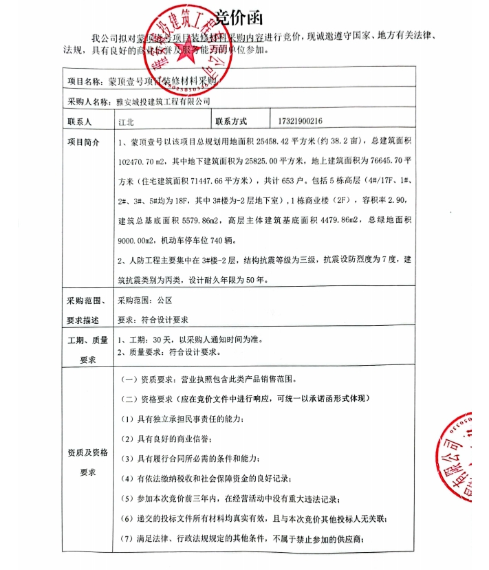 蒙頂壹號(hào)項(xiàng)目裝修材料采購競價(jià)公告