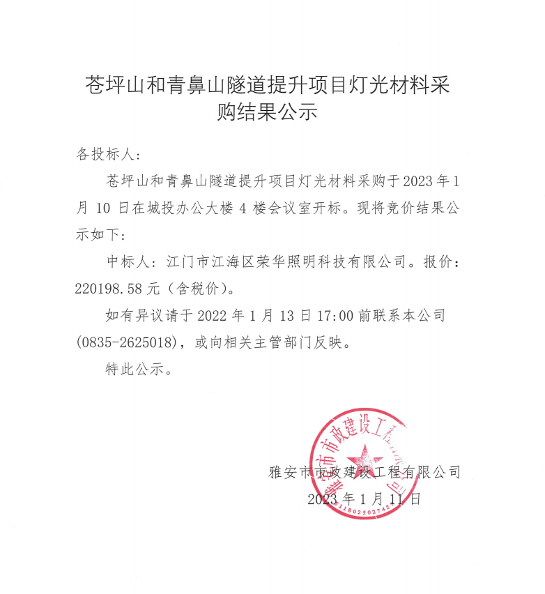 蒼坪山和青鼻山隧道提升項(xiàng)目燈光材料采購(gòu)結(jié)果公示