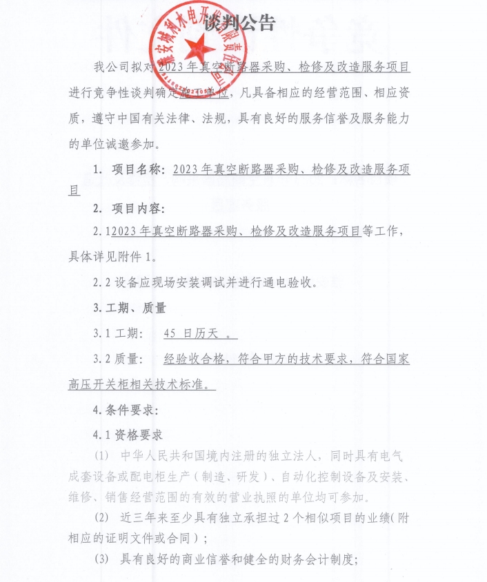 2023年真空斷路器采購、檢修及改造服務(wù)項目談判公告