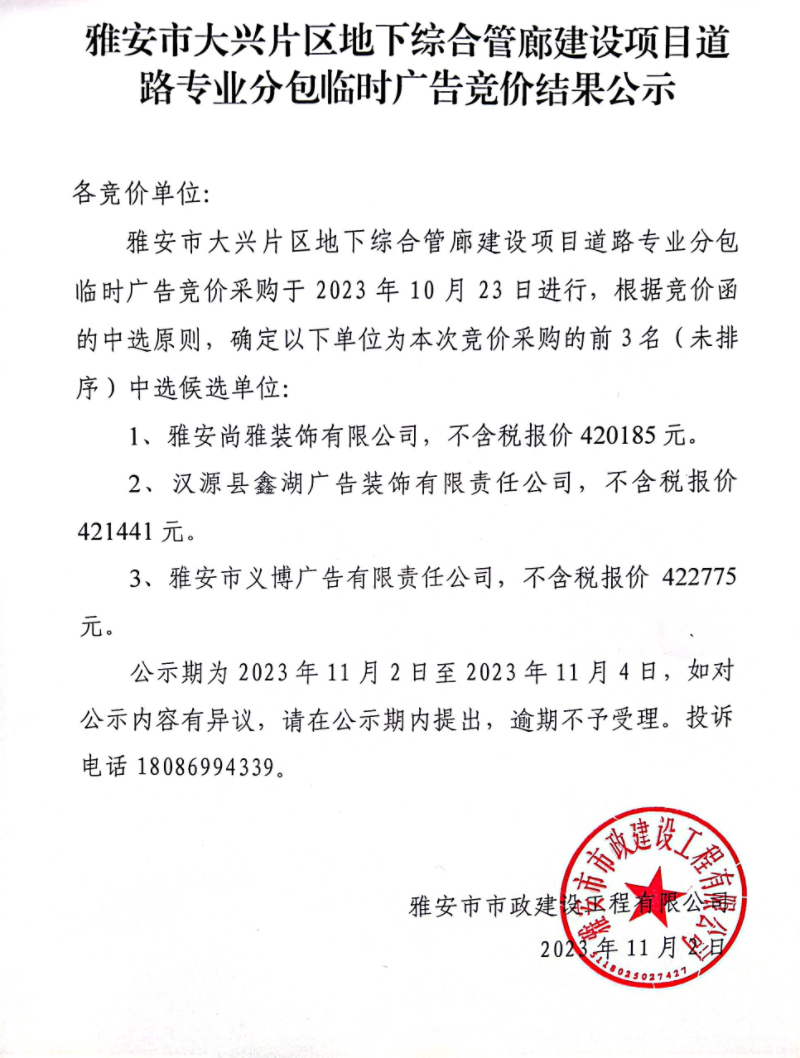 雅安市大興片區(qū)地下綜合管廊建設(shè)項(xiàng)目道路專業(yè)分包臨時(shí)廣告競價(jià)結(jié)果公示