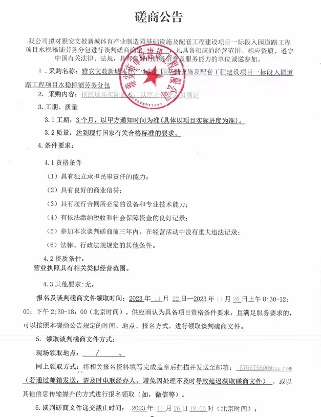 雅安文教新城體育產(chǎn)業(yè)制造園基礎(chǔ)設(shè)施及配套工程建設(shè)項目一標段入園道路工程項目水穩(wěn)攤鋪勞務(wù)分包磋商公告