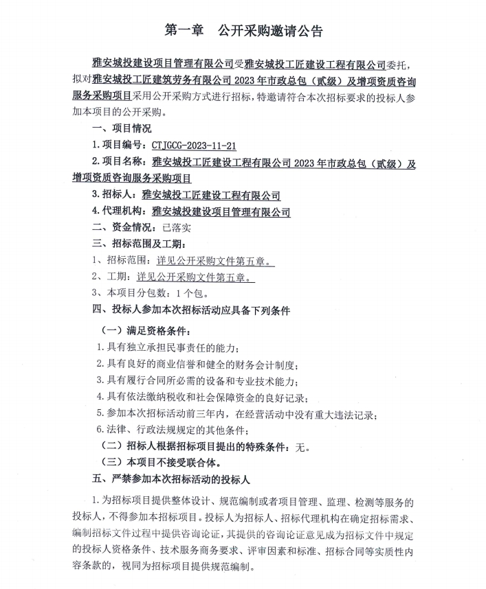雅安城投工匠建設(shè)工程有限公司2023年市政總包(貳級)及增項資質(zhì)咨詢服務(wù)采購項目公開采購邀請公告