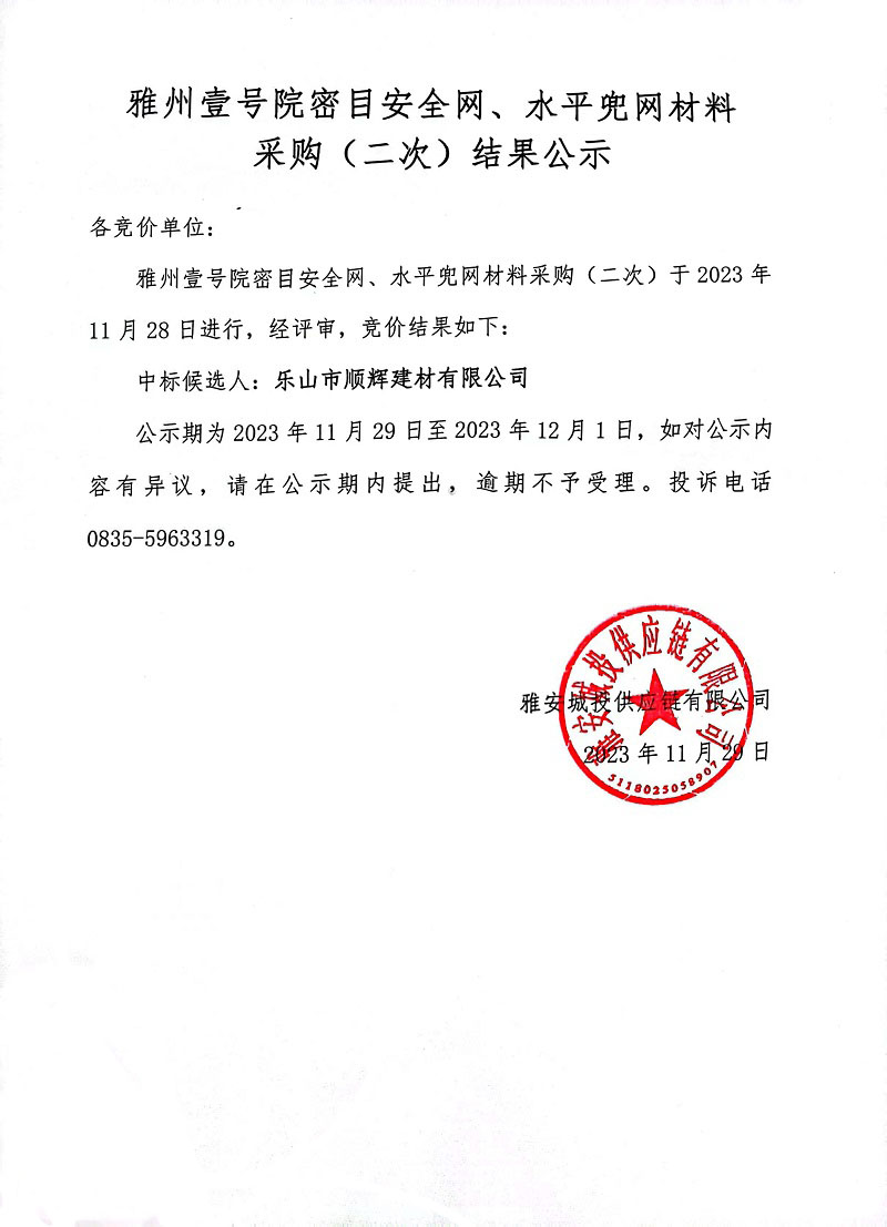 雅州壹號(hào)院密目安全網(wǎng)、水平兜網(wǎng)材料采購(gòu)(二次)結(jié)果公示