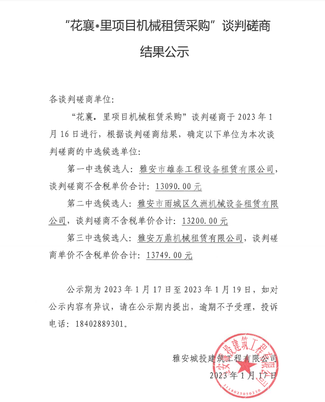 花襄·里項(xiàng)目機(jī)械租賃采購談判磋商結(jié)果公示