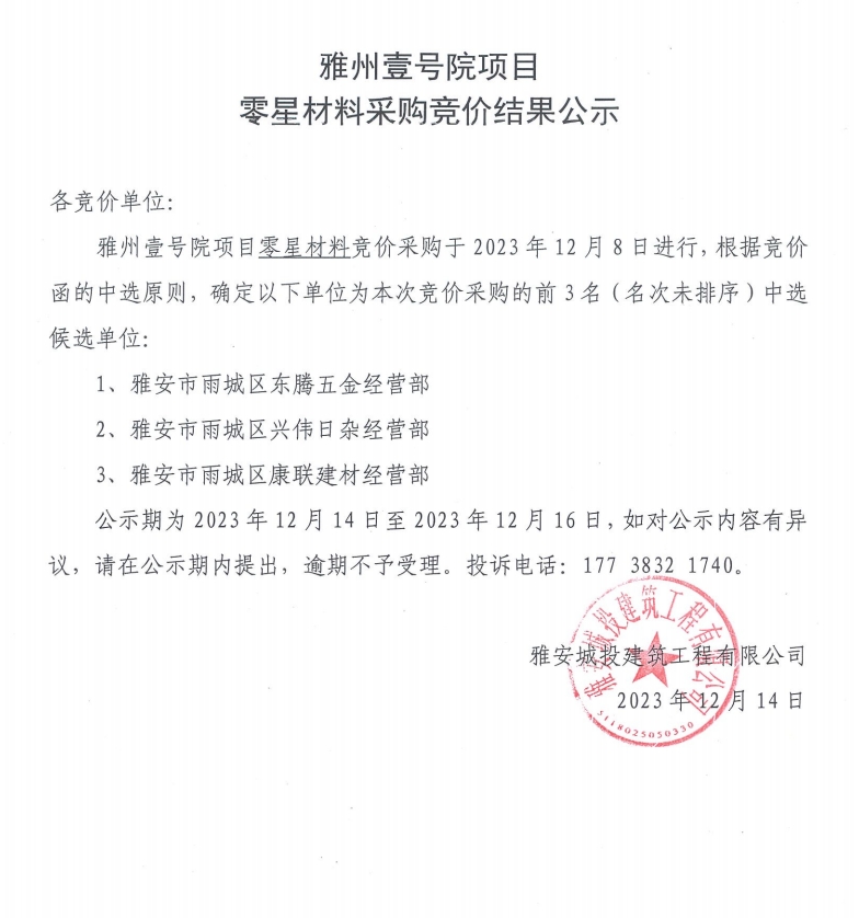 雅州壹號院項目零星材料采購競價結(jié)果公示