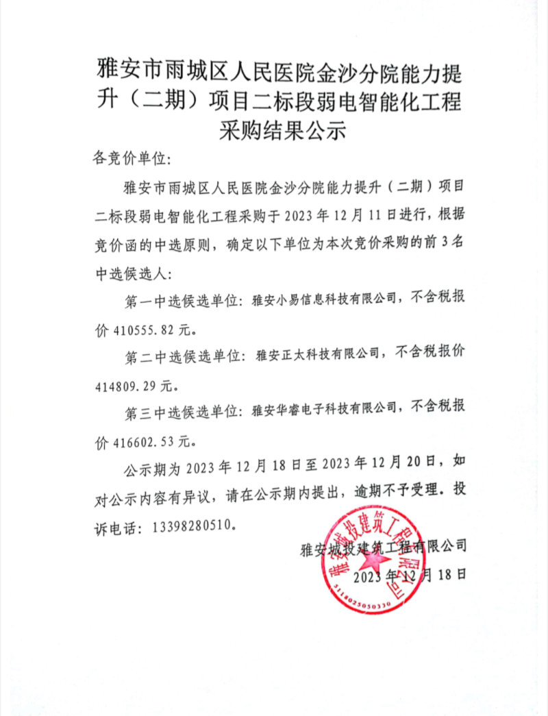 雅安市雨城區(qū)人民醫(yī)院金沙分院能力提升(二期)項(xiàng)目二標(biāo)段弱電智能化工程采購(gòu)結(jié)果公示
