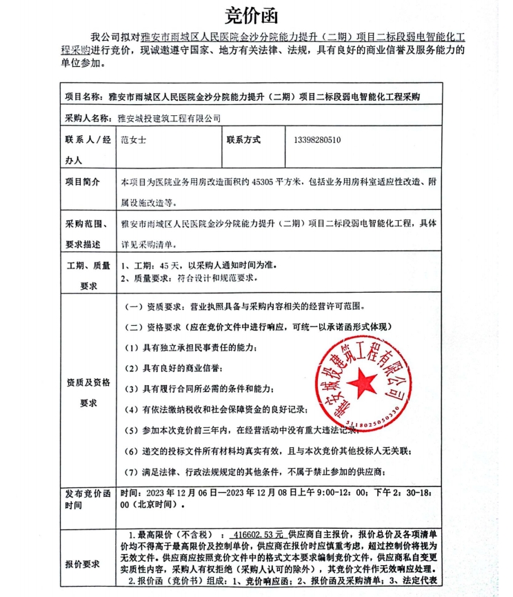 雅安市雨城區(qū)人民醫(yī)院金沙分院能力提升(二期)項(xiàng)目二標(biāo)段弱電智能化工程采購(gòu)競(jìng)價(jià)公告