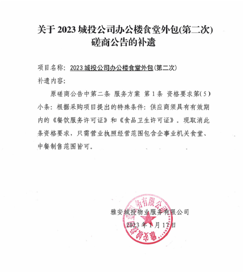 關于2023城投公司辦公樓食堂外包(第二次)項目競爭磋商公告補遺