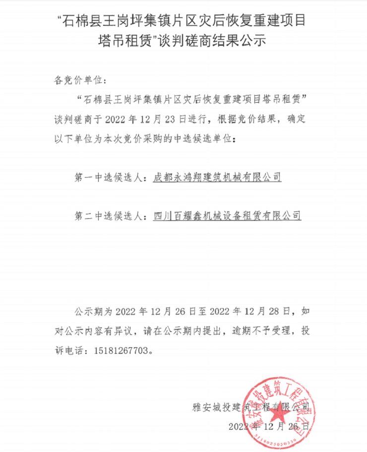 “石棉縣王崗坪集鎮(zhèn)片區(qū)災(zāi)后恢復(fù)重建項目塔吊租賃”談判磋商結(jié)果公示