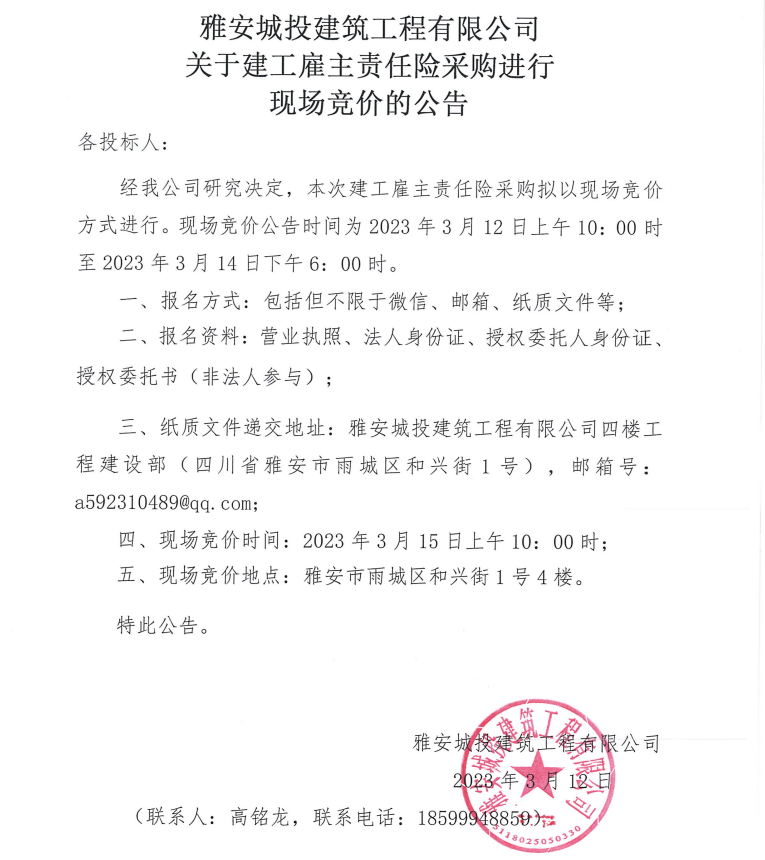 雅安城投建筑工程有限公司關(guān)于建工雇主責(zé)任險(xiǎn)采購(gòu)進(jìn)行現(xiàn)場(chǎng)競(jìng)價(jià)的公告