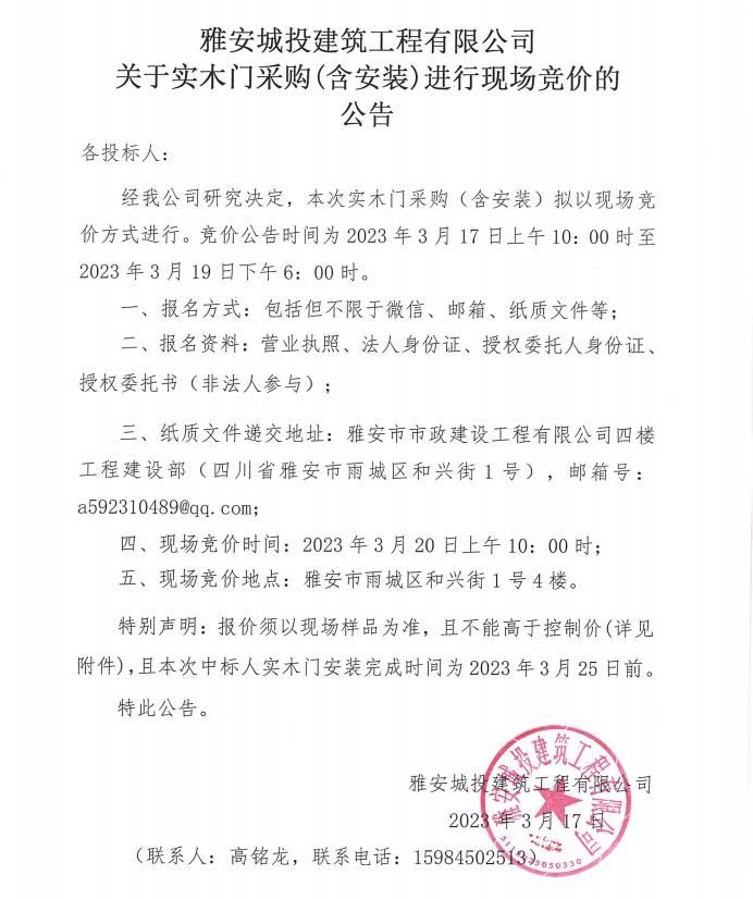 雅安城投建筑工程有限公司關(guān)于實木門采購(含安裝)進(jìn)行現(xiàn)場競價的公告