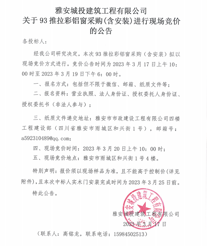雅安城投建筑工程有限公司關(guān)于93推拉彩鋁窗采購(gòu)(含安裝)進(jìn)行現(xiàn)場(chǎng)競(jìng)價(jià)的公告
