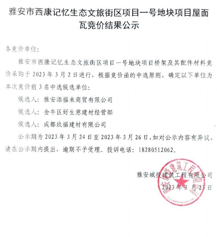 雅安市西康記憶生態(tài)文旅街區(qū)項目一號地塊項目屋面瓦競價結(jié)果公示
