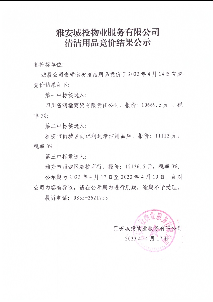 雅安城投物業(yè)服務有限公司清潔用品競價結果公示