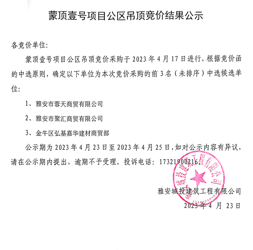 蒙頂壹號項(xiàng)目公區(qū)吊頂競價(jià)結(jié)果公示