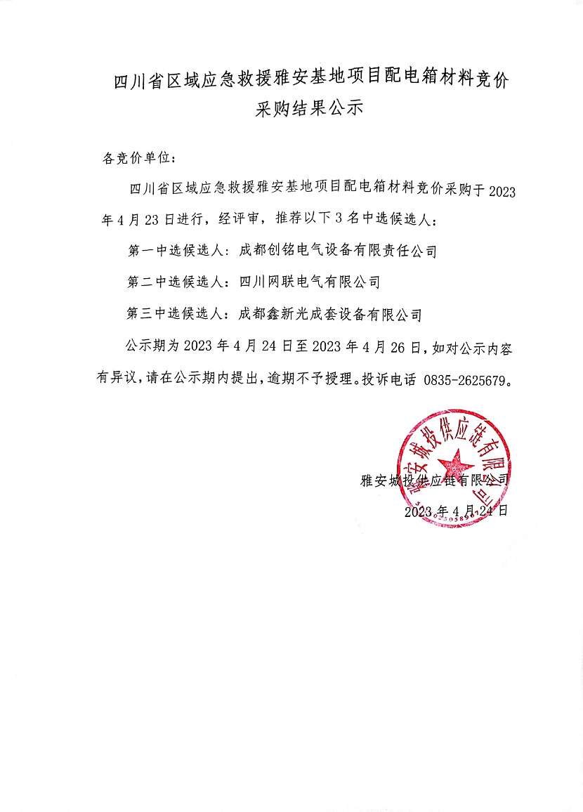 四川省區(qū)域應(yīng)急救援雅安基地項(xiàng)目配電箱材料競價(jià)采購結(jié)果公示