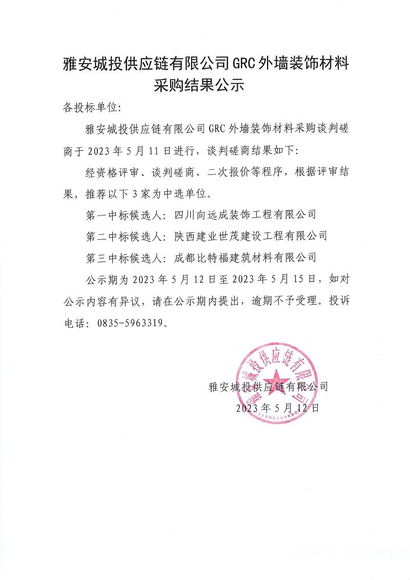 雅安城投供應(yīng)鏈有限公司GRC外墻裝飾材料采購結(jié)果公示