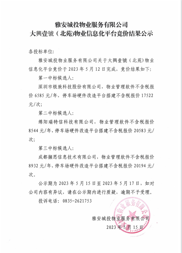 大興壹號(hào)(北苑)物業(yè)信息化平臺(tái)競價(jià)結(jié)果公示