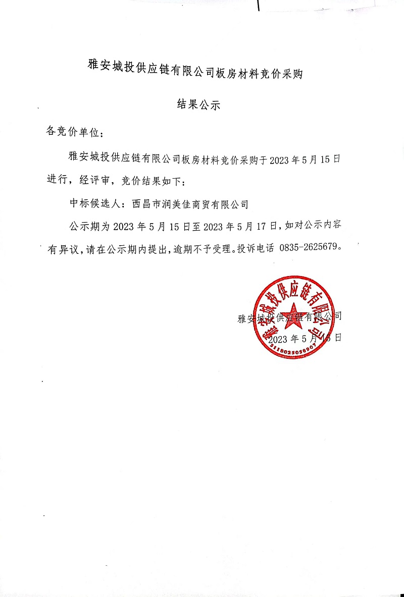 雅安城投供應(yīng)鏈有限公司板房材料競價采購結(jié)果公示