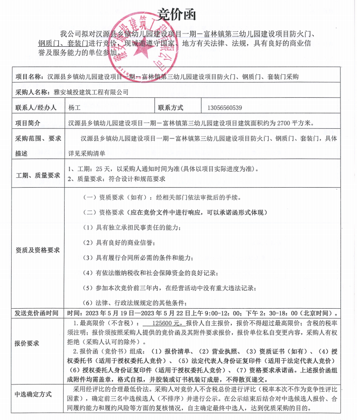 漢源縣鄉(xiāng)鎮(zhèn)幼兒園建設(shè)項(xiàng)目一期一富林鎮(zhèn)第三幼兒園建設(shè)項(xiàng)目防火門、鋼質(zhì)門、套裝門采購(gòu)競(jìng)價(jià)公告