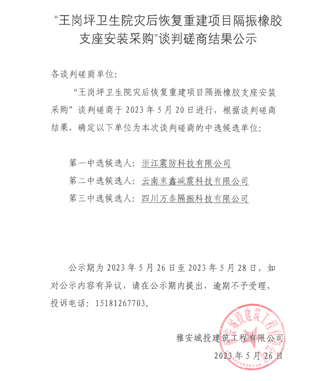 “王崗坪衛(wèi)生院災后恢復重建項目隔振橡膠支座安裝采購”談判磋商結果公示