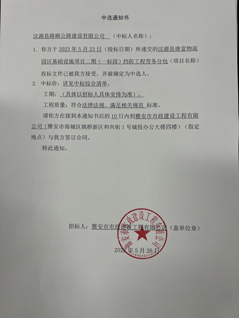漢源縣唐富物流園區(qū)基礎設施項目二期(一標段)擋防工程勞務分包中選通知書
