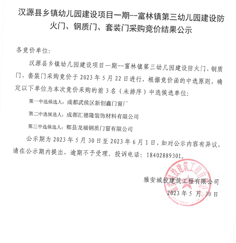 漢源縣鄉(xiāng)鎮(zhèn)幼兒園建設(shè)項(xiàng)目一期--富林鎮(zhèn)第三幼兒園建設(shè)防火門、鋼質(zhì)門、套裝門采購競價(jià)結(jié)果公示