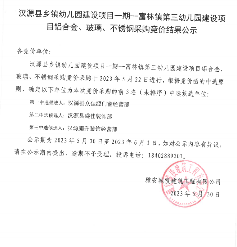 漢源縣鄉(xiāng)鎮(zhèn)幼兒園建設(shè)項(xiàng)目一期--富林鎮(zhèn)第三幼兒園建設(shè)項(xiàng)目鋁合金、玻璃、不銹鋼采購競價(jià)結(jié)果公示
