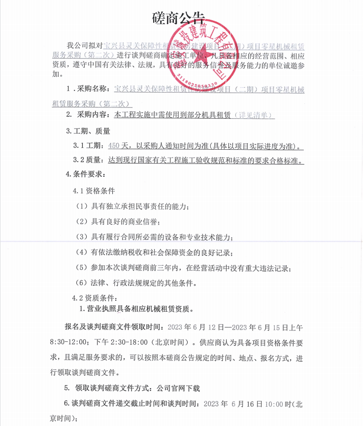 寶興縣靈關保障性租賃住房建設項目(二期)項目零星機械租賃服務采購(第二次)談判磋商公告