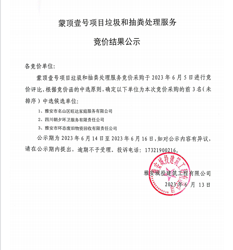 蒙頂壹號項(xiàng)目垃圾和抽糞處理服務(wù)競價(jià)結(jié)果公示