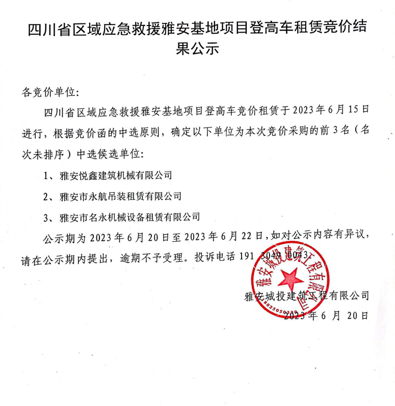 四川省區(qū)域應(yīng)急救援雅安基地項(xiàng)目登高車租賃競價(jià)結(jié)果公示