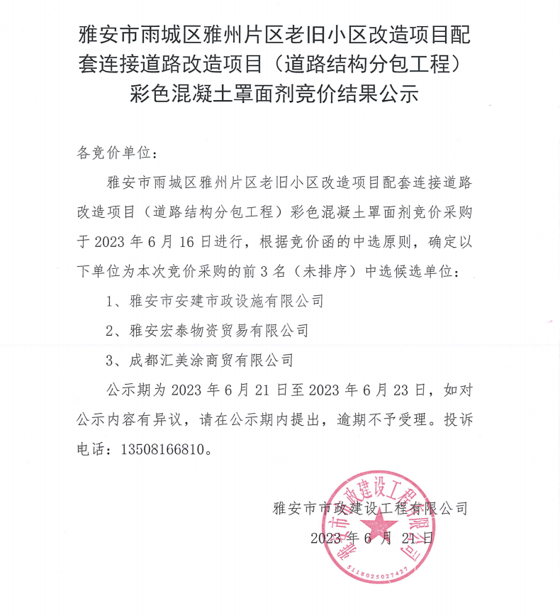 雅安市雨城區(qū)雅州片區(qū)老舊小區(qū)改造項(xiàng)目配套連接道路改造項(xiàng)目(道路結(jié)構(gòu)專業(yè)分包工程)彩色混凝土罩面劑競價(jià)結(jié)果公示