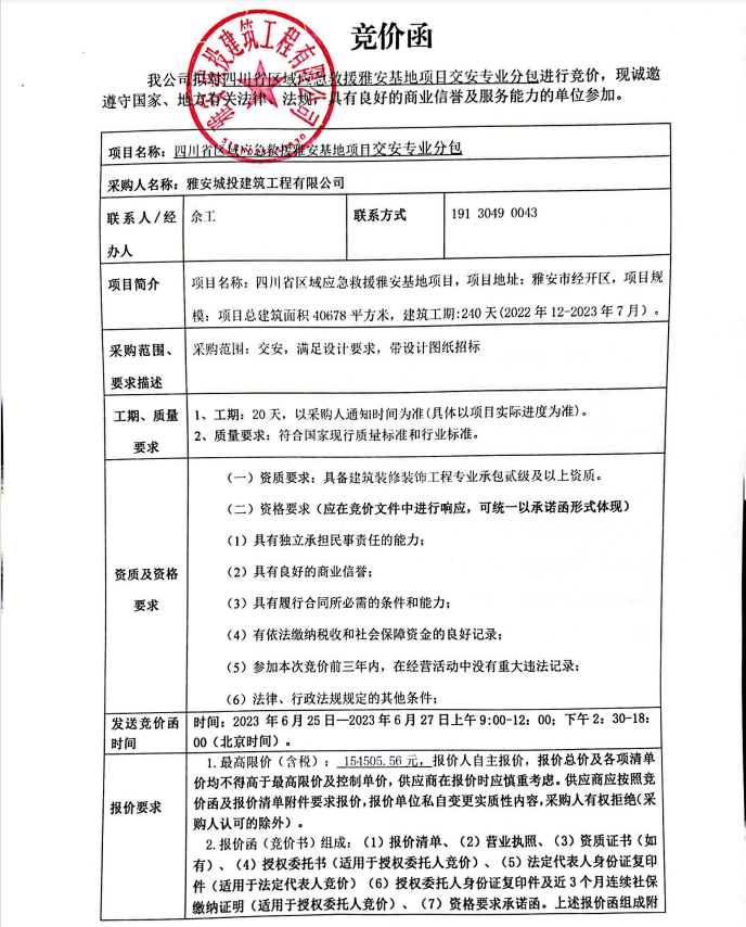 四川省區(qū)域應(yīng)急救援雅安基地項(xiàng)目交安專業(yè)分包競價(jià)公告