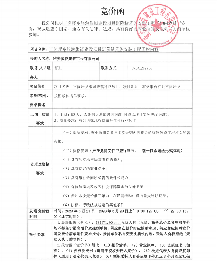 王崗坪鄉(xiāng)旅游集鎮(zhèn)建設(shè)項(xiàng)目沉降縫采購安裝工程采購內(nèi)容競價(jià)公告