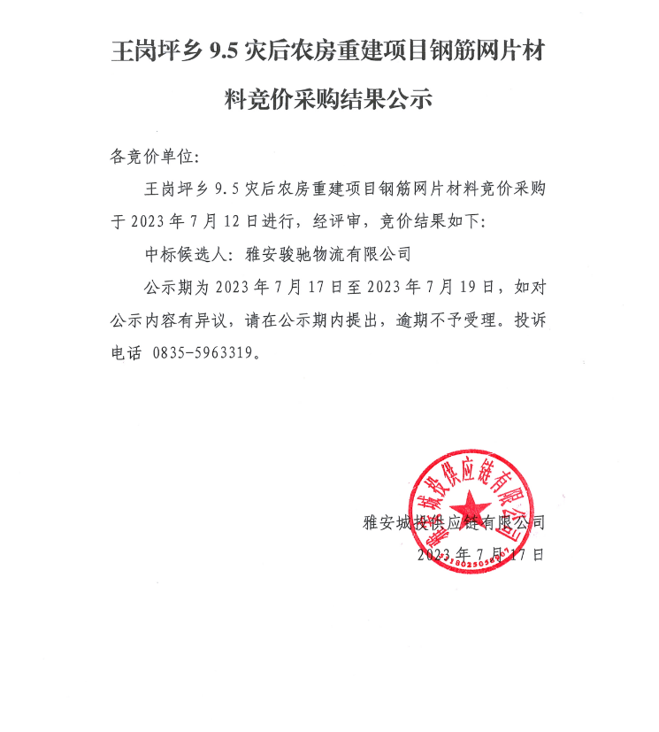王崗坪鄉(xiāng)9.5災(zāi)后農(nóng)房重建項(xiàng)目鋼筋網(wǎng)片材料競(jìng)價(jià)采購結(jié)果公示