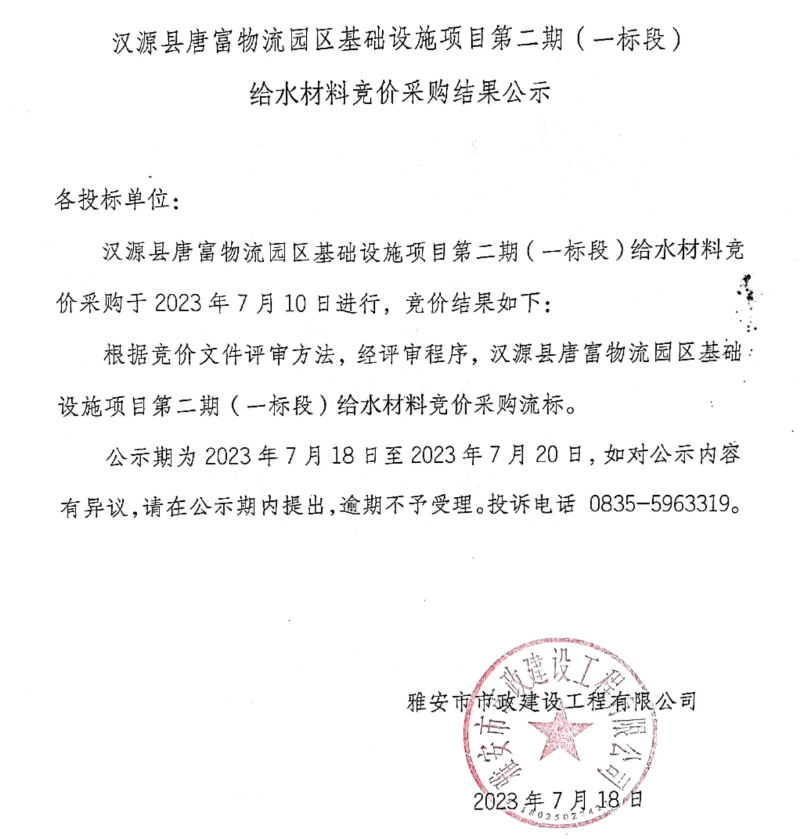 漢源縣唐富物流園區(qū)基礎(chǔ)設(shè)施項目二期(一標(biāo)段)給水材料競價采購結(jié)果公示